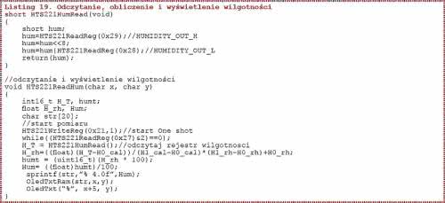 Podobnie wygląda sposób postępowania przy odczytywaniu, przeliczaniu i wyświetlaniu wilgotności. Wilgotność jest wyliczana w następujący sposób: H_rh = (((H_T - H0_cal))/(H1_cal - H0_cal) * (H1_rh - H0_rh) + H0_rh (rysunek 30). Procedurę odczytującą, przeliczającą i wyświetlającą wilgotność pokazano na listingu 19, natomiast wynik działania tej procedury na rysunku 31.