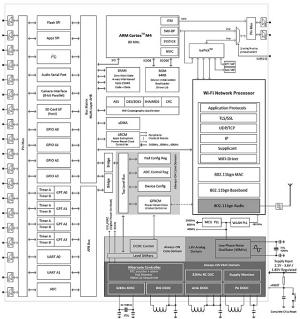 Na płytce zainstalowano mikrokontroler CC3200. Układ mikrokontrolera tworzą procesor użytkownika z rdzeniem ARM Cortex-M4 (wraz z blokami peryferyjnymi) oraz z procesor obsługujący transmisję Wi-Fi. Schemat blokowy CC3200 pokazano na rysunku 2. Szczegółowe parametry mikrokontrolera prezentuje tabela 1 oraz rysunek 3.