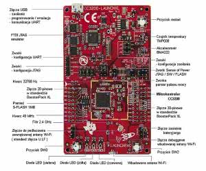 Poza mikrokontrolerem na płytce startowej LaunchPad umieszczono 3 przyciski (dwa użytkownika oraz jeden restart), 6 diod LED ( 3 użytkownika: żółta, zielona, czerwona, oraz 3 systemowe: żółta, zielona, czerwona), czujnik temperatury TMP008, akcelerometr BMA222, gniazdo USB (zasilanie, programowanie/emulacja, komunikacja UART via USB), dwa złącza rozszerzeniowe 20 pinowe w standardzie BosterPack, antenę WiFi 2.4 GHz. Płytka startowa posiada zamontowaną kość pamięci S-FLASH o pojemności jednego megabajta. Wygląd płytki startowej LaunchPad pokazano na rysunku 4.
