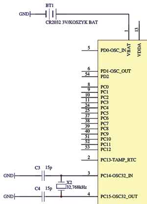Układ RTC do działania potrzebuje źródła precyzyjnych impulsów zegarowych. W mikrokontrolerze STM32 można wykorzystać w tym celu np. wewnętrzne impulsy taktujące, jednak lepiej posłużyć się specjalnym oscylatorem, którego działanie jest podtrzymywane za pomocą dodatkowej baterii litowej.