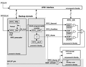 Rejestr RTC_CNT współdziała z rejestrem RTC_ALR. Gdy zawartość obydwu jest równa generowany zostaje sygnał alarmu RTC_Alarm. Sygnał alarmu może być źródłem przerwania lub służyć do wybudzenia kontrolera z trybu uśpienia oczywiście o ile jest w tym czasie podłączony do zasilania. Innymi źródłami przerwań mogą być sygnały sekund z podzielnika RTC prescaler i sygnał RTC_Overflow generowany w momencie przepełnienia rejestru RTC_CNT.