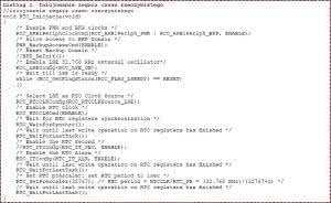 W czasie wyłączenia głównego zasilania zegar RTC jest podtrzymywany przez baterię jednak po restarcie należy każdorazowo zainicjować dostęp do jego rejestrów. Inicjacja jest szczególnie potrzebna po każdorazowym odłączeniu i dołączeniu baterii. Jeżeli w tym czasie główne zasilanie kontrolera także było odłączone wszystkie rejestry w Backup Domain zostaną wyzerowane, a oscylator kwarcowy 32768 Hz zatrzymany. Procedura inicjowania może wyglądać, jak na listingu 1.