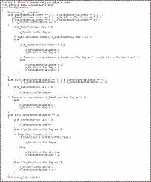 Ze względu na skomplikowaną strukturę kalendarza (różna liczba dni zależnie od miesiąca a nawet roku) aktualizacja daty nie może po prostu doliczać kolejnego dnia, ale musi uwzględniać wspomniane komplikacje. Dla tego doliczaniem zajmuje się wyspecjalizowana procedura DateUpdate(). Pokazano ją na listingu 5. Zależnie od sytuacji procesdura: