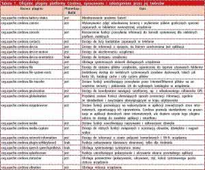W momencie powstawania tego artykułu liczba oficjalnie dostępnych pluginów Cordovy przekraczała 680. Niektóre z nich zostały opracowane przez samych twórców platformy i są zaliczane do pluginów podstawowych. Zostały one wymienione w tabeli 1 i obejmują przede wszystkim obsługę uniwersalnych funkcji sprzętowych, takich jak: nawigacja satelitarna, akcelerometr, powiadomienia, kamera itp.