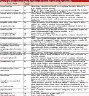W tabeli 2 zebraliśmy ciekawe pluginy, które mogą przydać się elektronikom. Kompletny zestaw wtyczek Cordovy można znaleźć pod adresem http://plugins.cordova.io/, a pluginy wspierane przez bezpłatną wersję usługi PhoneGap Build są wymienione na stronie pod adresem https://build.phonegap.com/plugins.