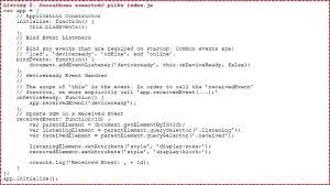 JavaScript jest językiem bardzo podobnym w notacji do języka C; jest prostszy i obsługuje obiekty. Linie komentarzy są poprzedzane albo podwójnymi ukośnikami, albo umieszczane w ukośnikach z gwiazdkami. Kod znajdujący się w pliku jest wykonywany automatycznie w momencie jego załadowania. W przypadku pliku index.js wykonywana jest najpierw deklaracja zmiennej (obiektu) app, a następnie uruchamiane jest polecenie initialize(), będące funkcją obiektu app.