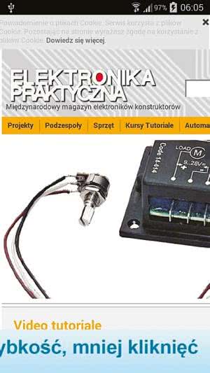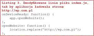 Na początek po prostu załadujmy jakąś stronę internetową, gdy tylko aplikacja się w pełni uruchomi i urządzenie będzie gotowe do pracy. W tym celu, w pliku index.js tworzymy funkcję app.openWebsite(), która za pomocą polecenia location.replace() przekierowuje nas na wybraną stronę internetową. Ponadto modyfikujemy funkcję app.onDeviceReady(), tak by uzyskać kod jak na listingu 3. Uruchomienie tej aplikacji (po uprzednim skompilowaniu jej z użyciem polecenia cordova build) powoduje wyświetlenie strony internetowej Elektroniki Praktycznej na ekranie telefonu lub symulatora (rysunek 1). To teoretycznie nic specjalnego, gdyż tę samą operację moglibyśmy wykonać za pomocą przeglądarki internetowej, ale warto zauważyć, że w oknie nie mamy paska adresu, ani nie możemy korzystać z żadnych gestów (choć to zależy od ustawień). Możemy się jedynie poruszać po stronie i korzystać ze znajdujących się na niej linków, które nadal będą otwierały się w oknie aplikacji. Przypomina to działanie przeglądarki internetowej w trybie kiosk, który stosowany jest czasem tam, gdzie trzeba ograniczyć użytkownikom dostęp do nieautoryzowanych stron.
