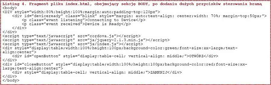 Listing 4. Fragment pliku index.html, obejmujący sekcję BODY, po dodaniu dużych przycisków sterowania bramą