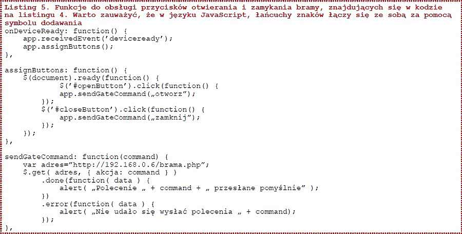 Załóżmy teraz, że za pomocą telefonu komórkowego chcemy sterować ruchem automatycznej bramy. Przyjmijmy, że jej sterownik jest podłączony do sieci lokalnej i ma prosty interfejs webowy z dwoma przyciskami. Możemy go wywołać za pomocą przeglądarki internetowej, albo stworzyć aplikację, która zaraz po uruchomieniu załaduje treść tej strony. W tym celu podmieniamy adres strony EP z listingu 3 na adres interfejsu webowego sterownika napędu bramy, uzyskując linię np.: location.replace('http://192.168.0.6/brama.php');