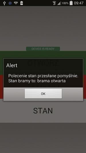 Nasz sterownik bramy działa poprawnie i w przypadku, gdy brama jest otwarta, na żądanie akcji "stan" odpowiada generując ciąg znaków: