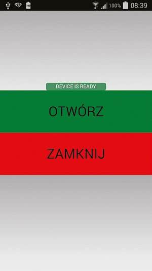 Do kontrolowania bramy stworzymy w naszej aplikacji dwa duże przyciski, które będą powodowały wysłanie odpowiednich żądań AJAXowych do sterownika. Z pliku index.html usuwamy niepotrzebne elementy graficzne i dodajemy linijki z nowymi warstwami, które posłużą nam za zielony i czerwony przycisk sterujący. Sekcja BODY pliku index.html wygląda wtedy tak, jak na listingu 4. W pliku index.js dodajemy nowe funkcje: app.assignButtons() i app.sendGateCommand() oraz modyfikujemy funkcję app.onDeviceReady(), tak by wywoływała polecenie przypisania działań do przycisków, tak jak to zostało przedstawione na listingu 5. W efekcie, uruchomiona aplikacja wygląda tak, jak na rysunku 3.