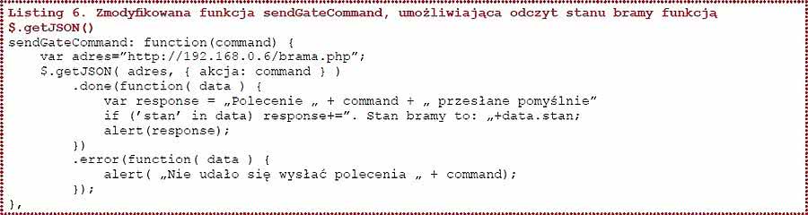 Polecenie sendGateCommand() będzie więc wywoływane zawsze, gdy naciśniemy zielony lub czerwony przycisk, tyle że z różnymi parametrami. W definicji funkcji sendGateCommand() znalazła się deklaracja zmiennej z adresem, pod który ma być wysyłane żądanie AJAX oraz samo wywołanie AJAXowe pod podany adres, z parametrem przekazywanym jako argument funkcji sendGateCommand() i z deklaracjami funkcji, które mają się wydarzyć w przypadku sukcesu lub niepowodzenia komunikacji ze sterownikiem bramy. Warto zwrócić uwagę na sposób wywołania polecenia $.get(). Jako pierwszy argument podawany jest adres wywołania, a jako drugi, lista przekazywanych, oddzielonych przecinkami parametrów, podana w nawiasach klamrowych, złożona z nazw parametru i ich wartości, oddzielonych od siebie dwukropkiem. Co ciekawe, po funkcji $.get() nie pojawia się średnik, ale kropka i funkcja $.done(), a następnie $.error(). Wynika to ze specyfiki biblioteki jQuery, która pozwala na wygodne kolejkowanie odnoszących się do siebie funkcji. W tym przypadku, taka deklaracja pozwala określić, co ma się zdarzyć w przypadku pomyślnego ukończenia wywołania AJAX GET, a co jeśli wywołanie się nie uda. My w obu sytuacjach wywołujemy systemowe okienko dialogowe z adekwatnym komunikatem, korzystając ze standardowej funkcji alert().