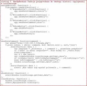 Warto przeanalizować funkcje assignButtons() i sendGateCommand(). Pierwsza z nich czeka na załadowanie się całego kodu strony z pliku index.html i innych, których pobranie wynika z kodu index.html. W tym celu zastosowano polecenie