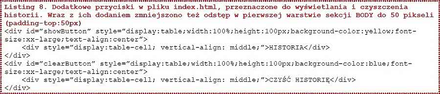 Listing 8. Dodatkowe przyciski w pliku index.html, przeznaczone do wyświetlania i czyszczenia historii. Wraz z ich dodaniem zmniejszono też odstęp w pierwszej warstwie sekcji BODY do 50 pikseli (padding-top:50px)