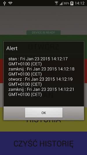 Zmodyfikowany kod funkcji app.sendGate Command(), nowe funkcje do prezentacji i czyszczenia historii oraz zmodyfikowaną funkcję app.assignButtons(), rozszerzoną na potrzeby obsługi dodatkowych przycisków, pokazaliśmy na listingu 7, a dodatkowe warstwy z nowymi przyciskami z pliku index.html, zaprezentowaliśmy na listingu 8. Natomiast na rysunku 5 widać kompletną aplikację z wyświetlonym komunikatem z historią zdarzeń.