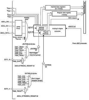 Napięcie do konwersji wybierane jest przez analogowy multiplekser spośród jednego z 16 kanałów ADCx_IN0...15 lub z dodatkowego wewnętrznego źródła np. z sensora temperatury.