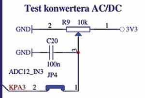 Podane w dalszej części artykułu przykłady łatwo można przetestować przy pomocy Panelu Edukacyjnego. Jako pojedyncze wejście analogowe wykorzystano kanał IN3 będący portem PA3. Do uzyskania testowego napięcia o zmiennym poziomie służy zamontowany na płytce Panelu potencjometr R9. Fragment schematu z elementami dołączonymi do wejścia analogowego IN3 pokazany został na rysunku 2.