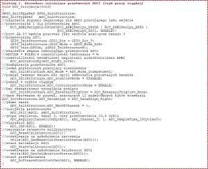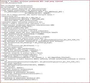 Najpierw port PA3 inicjowany jest do pracy jako wejście analogowe kanału 3 przetwornika. Podłączane są impulsy zegarowe do portu i przetwornika. Następnie ADC1 ustawiany jest w trybie pracy ciągłej. Wynik konwersji będzie wyrównywany do prawej, co znaczy, że będzie umieszczany w 12 mniej znaczących bitach 16 bitowego rejestru danych. Po włączeniu przetwornika powinna zostać przeprowadzona procedura auto kalibracji. Na koniec komendą ADC_ SoftwareStartConvCmd(ADC1, ENABLE) włączany zostaje proces ciągłej konwersji.