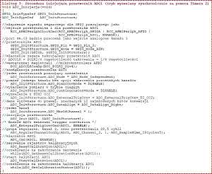 W tym przykładzie po zainicjowaniu przetwornik dokonuje ciągłych pomiarów napięcia na wejściu IN3. Pracuje w trybie regular co oznacza, że wyniki kolejnych pomiarów umieszczane są w tym samym rejestrze regular data register. Procedura inicjując przetwornik A/C może wyglądać jak na listingu 1.
