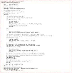 Na początku procedury wyświetlany jest ekran informacyjny Weather Forecast. (ikona prezentowana na ekranie pulsuje do momentu odczytu i analizy prognozy pogody). Następnie jest uruchamiana procedura podłączenia sterownika do Access Point (procedura Connect2AccessPoint). Kod źródłowy procedury pokazano na listingu 2. W przypadku błędu połączenia włączana jest dioda koloru żółtego.