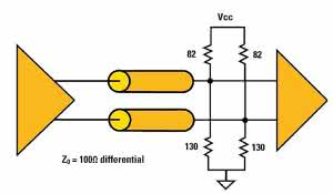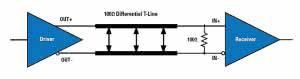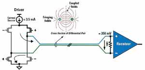 Typowa para sterownik-odbiornik LVDS jest przedstawiona na rysunku 1. Sterownik wyposażono w źródło prądowe o nominalnej wartości natężenia 3,5 mA. Ponieważ impedancja wejściowa odbiornika jest wysoka, praktycznie cały prąd przepływa przez rezystor terminujący 100 V, co przekłada się na nominalną amplitudę 350 mV napięcia pomiędzy wejściami odbiornika.