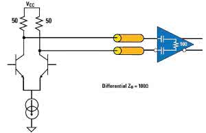 Prosty schemat z rysunku 2 obrazuje zalety wspólne dla wszystkich różnicowych technik transmisji sygnałów. Po pierwsze, źródło prądowe jest zawsze włączone i przewodzi w różnych kierunkach podczas wysterowania logicznej jedynki lub zera. Takie rozwiązanie eliminuje zakłócenia impulsowe i interferencje elektromagnetyczne powstające wskutek przełączania tranzystorów przewodzących duże prądy.
