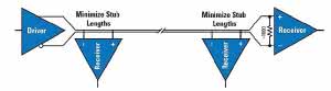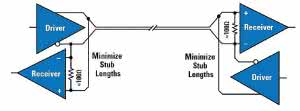 Na rysunku 5 przedstawiono typową parę: sterownik i odbiornik w topologii punkt-punkt. Kontrolowana impedancja łącza, odpowiednie obciążenie odbiornika i terminacja są kluczowymi aspektami projektowania systemu zapewniającego niski jitter transmisji.