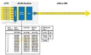 Serializer typu 8b/10b dokonuje konwersji każdego bajtu złożonego z 8 bitów na 10-bitowy kod i przesyła uzyskany 10-bitowy kod przez szeregową parę różnicową. 10-bitowe kody transmisyjne zostały opracowane przez firmę IBM na początku lat 1980 i gwarantują wielokrotne występowanie zboczy sygnału w każdym bajcie oraz usunięcie składowej stałej poprzez równoważenie liczby zer i jedynek. Częste zmiany stanu w strumieniu pozwalają odbiornikowi na synchronizację z odbieranymi danymi. Usunięcie składowej stałej umożliwia stosowanie sprzężenia AC, długich kabli i modułów optycznych.