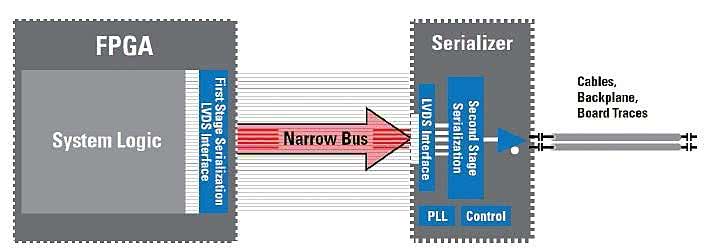 Rysunek 11. Zewnętrzny SerDes dołączony do FPGA zajmuje się realizacją funkcji analogowych na sygnale odbieranym i wysyłanym przez LVDS