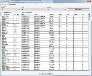 Okno selektora ma dwie zakładki: MCU Selector i Board Selector. Wybierając MCU Selector można filtrować potrzebne zasoby wybierając: