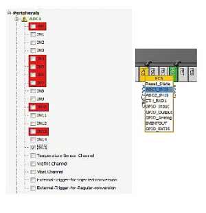 - Jeżeli chcemy, aby wyprowadzenie PC5 było wejściem przetwornika A/C, to ponownie na nie klikamy i wybieramy ADC1_IN15. Teraz wyprowadzenie jest wyświetlane na na pomarańczowo.