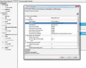 Okno konfiguracji ma cztery zakładki: Parameter Settings, NVIC Settings, DMA Settings i GPIO Settings. Za pomocą Parameter Settings ustawia się parametry pracy przetwornika, miedzy innymi: tryb pracy, częstotliwość taktowania (preskaler PCLK2), rozdzielczość w bitach, sposób umieszczenia danych w słowie (data Alignment) itp.