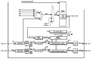 Jego schemat blokowy pokazano na rysunku 10. W trybie zliczania UP (Upcounting) licznik zlicza od zera do wartości zapisanej do rejestru Auto-reload register. Kiedy zawartość licznika i rejestru Auto-reload są sobie równe, to rejestr licznika jest zerowany i odliczanie rozpoczyna się od nowa. W czasie zerowania licznika może być zgłaszane przerwanie.