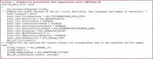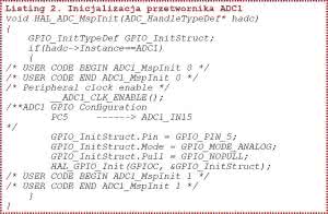 Kod inicjalizacji przetwornika wygenerowany przez STM32CubeMX pokazano na listingu 1. Skonfigurowany przetwornik trzeba jeszcze zainicjalizować. Inicjalizacja będzie wymagała włączenia taktowania modułu A/C i ustawienia wyprowadzenia PC5 jako wejścia analogowego. STM32Cube MX automatycznie generuje funkcję inicjalizacyjną HAL_ADC_MspInit (Msp od MCU support package). Ta funkcja jest umieszczana przez generator w pliku stm32f4xx_hal_msp.c, a jej wywołanie wygląda następująco - "HAL_ADC_MspInit(& hadc1);".