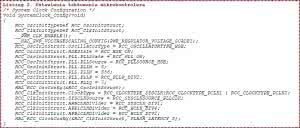 Oprócz konfigurowania ścieżki sygnału taktowania zakładka Clock Configuration pokazuje na bieżąco, jakie częstotliwości są ustawione dla wszystkich bloków mikrokontrolera: rdzenia, magistrali AHB, modułów peryferyjnych APAB1, APB2 itp. Po wygenerowaniu kodu ustawienia z zakładki Clock Configurator są zapisywane w zamieszczonej na listingu 3 funkcji SystemClockConfig dostępnej w pliku main.c.