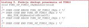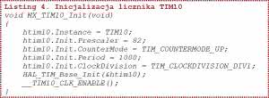 W zakładce Configuration klikamy na ikonkę TIM10, co powoduje wyświetlenie okna TIM10 Settings. W zakładce Parameter Settings ustawiamy: wartość preskalera równą 82, tryb zliczania UP, okres zliczania równy 1000. Aby licznik zgłaszał przerwanie należy z w zakładce NVIC Settings wybrać TIM10 Update Interrupt and TOM10 global Interrupt Enabled. Oba ustawienia pokazano na rysunku 11. Na ich podstawie STM32CubeMX wygeneruje kod zawierający pokazaną na listingu 10 funkcję inicjalizacji licznika TIM10 oraz funkcję obsługi przerwania - listing 5.