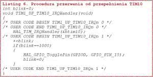 Na końcu pozostaje w obsłudze przerwania zaświecać i gasić wybrana diodę. Ponieważ przerwanie jest zgłaszane co 1 ms, to trzeba odliczyć 1000 przerwań, aby dioda pulsowała co 1 sekundę. Do tego celu zostanie użyta zmienna globalna blink, jak na listingu 6.