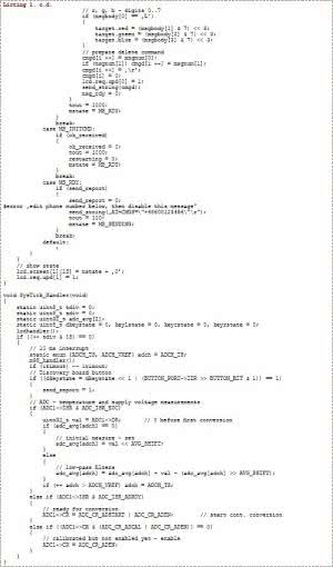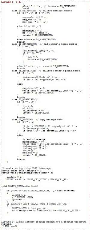 Odpowiedź na polecenie AT+CMGL zawiera listę wiadomości, zakończoną napisem OK. Każdy element listy jest rozpoznawany przez parser odpowiedzi z modułu, który zapisuje dane pierwszej wiadomości z listy. W ten sposób po zakończeniu odpowiedzi, co jest sygnalizowane przez parser ustawieniem znacznika ok_received i pobraniu przez parser wiadomości (znacznik msg_rdy) automat może zinterpretować treść pierwszej wiadomości, a następnie wydać polecenie jej skasowania AT+CMGD=<numer_wiadomości>, niezbędne dla umożliwienia odbioru kolejnych wiadomości (listing 2).