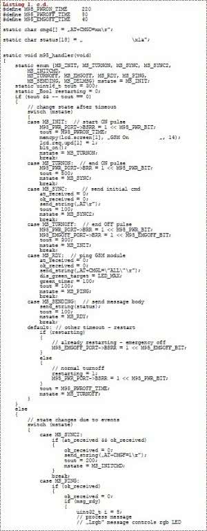 Główny automat urządzenia odpowiada za współpracę z modułem GSM i realizację podstawowej funkcjonalności urządzenia. Logika automatu została zawarta w procedurze M95_handler(), wywoływanej z procedury obsługi przerwania timera systemowego. Zmiany stanów automatu zachodzą na podstawie zdarzeń specyficznych dla poszczególnych stanów oraz - w przypadku niewystąpienia zdarzenia - w wyniku przekroczenia limitu czasu spędzanego w poszczególnych stanach (listing 1).