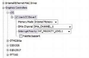 - Drivers → Graphics Controllers → LCC. Opcja LCC oznacza sterownik wyświetlacza LCD zaimplementowany w mikrokontrolerze. Po wybraniu LCC możemy ustawić pamięć obrazu zaimplementowaną w mikrokontrolerze (Internal Memory) lub w układzie zewnętrznym (External Memory), kanał DMA do zapisywania tej pamięci oraz ustalić priorytet przerwań. Konfigurację sterownika grafiki pokazano na rysunku 2.
