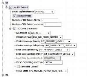 - Drivers → I²C. Interfejs I²C jest używany do komunikacji ze sterownikiem panelu dotykowego. Konfigurację I²C pokazano na rysunku 3. Warto zwrócić uwagę na to, że zaimplementowano driver dynamiczny i do obsługi magistrali wykorzystuje on przerwania.