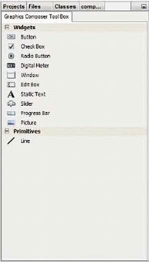 - Graphics Composer Tool Box z widżetami i primitives (rysunek 6). W aktualnej wersji Composera lista elementów jest uboższa w porównaniu z ostatnią wersją GDDX, ale ma to się zmienić. Elementy z tego okna są wybierane i umieszczane na projektowanych ekranach.