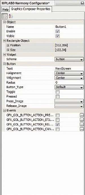 Aplikację możemy wygenerować automatycznie z poziomu MPLAB Harmony Graphic Composer. Na ekranie MainScreen klikamy na przycisk Next Screen, a w oknie Properties zaznaczamy jedną z akcji: