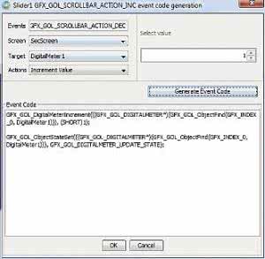 W tym celu klikamy na obiekt Slider i w oknie Properties wybieramy Events → GFX_GOL_SCROLLBAR_ ACTION_INC. Otwieramy okno Event Code Generation. W oknie Screen wybieramy SecScreen, a w oknie Target - Digital Meter1. Przesuwanie suwaka w prawo lub do góry będzie wywoływało akcję w obiekcie Digital Meter1.