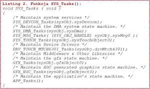 W każdej aplikacji MPLAB Harmony funkcja main zawiera pętlę nieskończoną wywołującą cyklicznie funkcję SYS_Tasks();, jak pokazano na listingu 2.