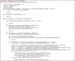 Na listingu 1 pokazano funkcje obsługi przerwań używanych do obsługi wyświetlacza. Funkcja DRV_ TOUCH_MTCH6301_ReadRequest(); jest przeznaczona do wysyłania zapytania do podprogramu obsługi I²C, odbierania od niego danych odczytywanych za pomocą I²C ze sterownika MCTH6301 i umieszczania tych danych w kolejce. Potem tymi danymi - umieszczonymi w buforze drvI²CReadFrameData - "zajmuje się- procedura DRV_TOUCH_MTCH_Tasks.