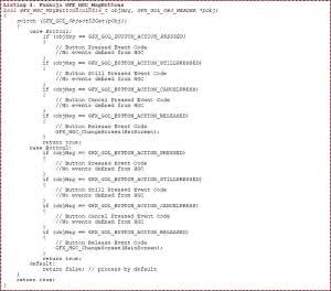 Zaznaczyłem akcję GFX_ GOL_BUTTON_ACTION _ RELEASED wykonywaną po wykryciu zwolnienia przycisku. Po kliknięciu na ikonie z prawej strony zaznaczonej akcji otwiera się okno Button1 GFX_GOL_BUTTON_ACTION_ RELEASED event code generation (rysunek 9).