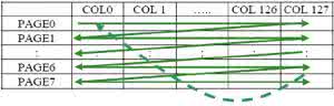 Jedna strona zawiera 128 bajtów. Zapisanie bajtu do pamięci odpowiada pionowej linijce o długości 8 pikseli (rysunek 5). Aby zapewnić elastyczność przy mechanicznym mocowaniu wyświetlacza jest możliwe remapowanie segmentów: są one wybierane licząc od lewej do prawej, od 127 do 0. Podobnie są remapowane linie matrycy. Remapowaniem sterują dwie komendy: Set Segment Re-map (A0/ A1) i Set COM Output Scan Direction (C0/C8).