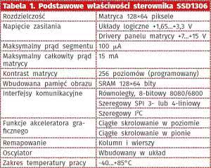 Podstawowe właściwości sterownika zostały pokazane w tabeli 1, a schemat blokowy sterownika pokazano na rysunku 1. Układ SSD1306 ma możliwość komunikowania się z systemem nadrzędnym za pomocą magistrali równoległej w standardzie Intel 8080 lub Motorola 6800 oraz za pomocą interfejsu szeregowego SPI lub I²C.