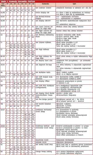Przy okazji omawiania adresowania pamięci RAM obrazu opisałem kilka komend przeznaczonych do wyboru trybu adresowania i ustawiania liczników adresu. Sterownik SSD1306 ma spory zestaw komend sterujących. Dokładne opisywanie wszystkich znacznie wykracza poza zakres tego artykułu i nie jest też konieczne, bo dane te można znaleźć w dokumentacji. W tabeli 3 umieszczono zestawienie wszystkich komend.